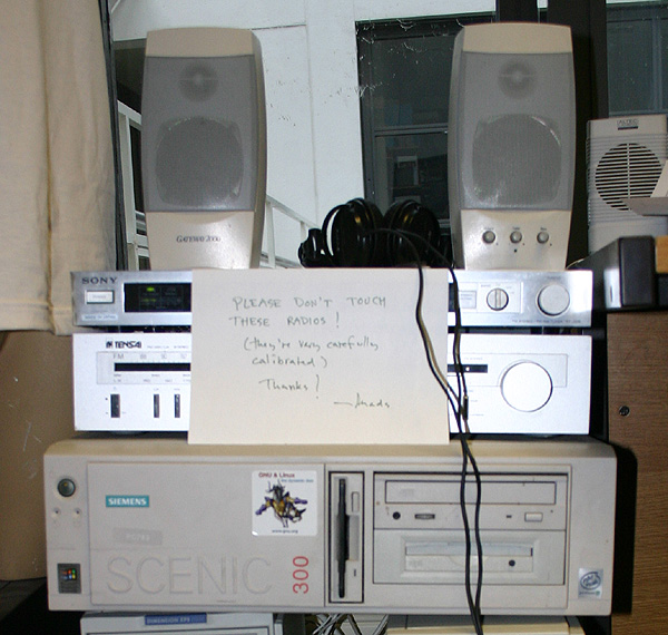 Just left of the radio, you see the rear panel of the Sun SPARCstation I was using. I have no idea how fast it was, but it didn't seem fast, not even then. However, it did have 96 MB of memory, which was a lot at the time, so it could easily run the software, and it also had a built-in sound card and was therefore easy to connect to the radio. The machine ran the Solaris operating system, which was incredibly stable and therefore perfectly suited for the purpose. On the very left in the picture, you see the 500 MB (yes, that's megabytes) SCSI disk that held the files. Behind the radio, you can just about make out the UPS, which was a later addition.